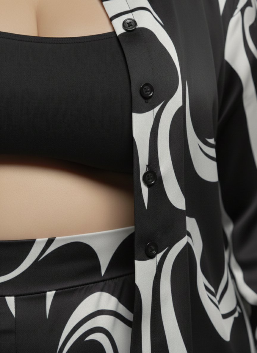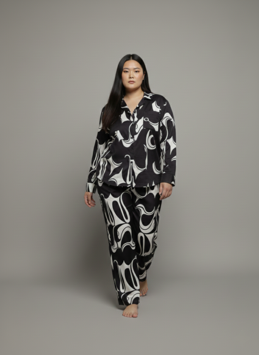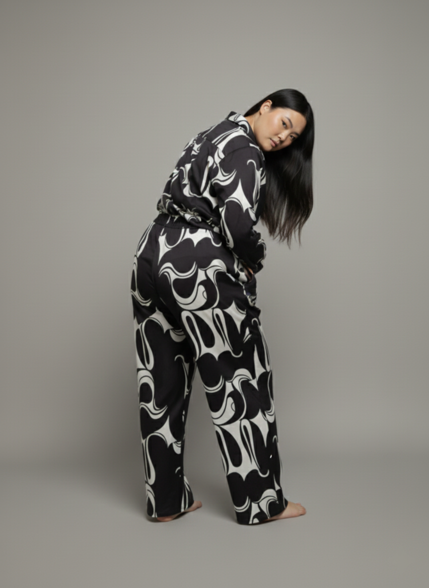 חליפה שחורה-לבנה דרמטית עם הדפס גלים אמנותי. לוק לא מתאמץ שגונב את ההצגה. חולצה מכופתרת רחבה ומכנסיים מתרחבים בגזרה משוחררת, שיוצרים יחד מראה מתוחכם, נינוח ומלא ביטחון.