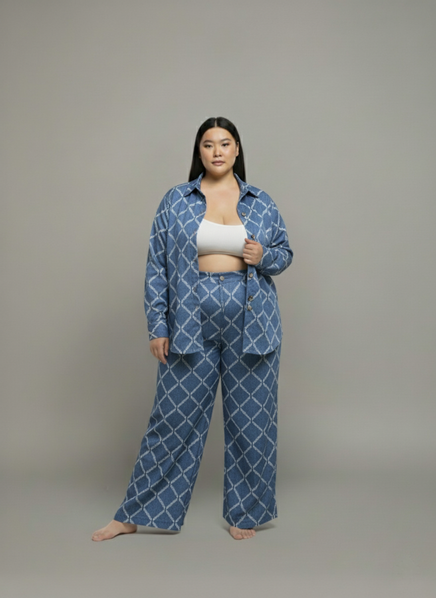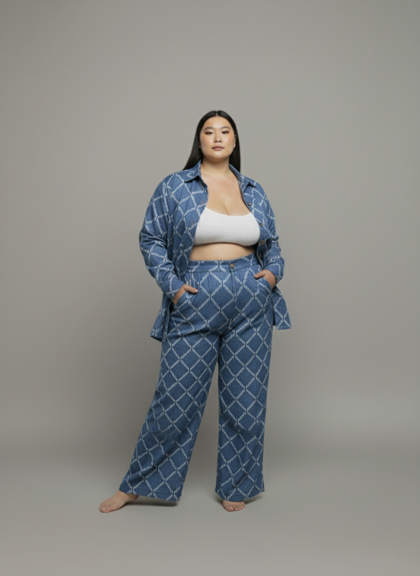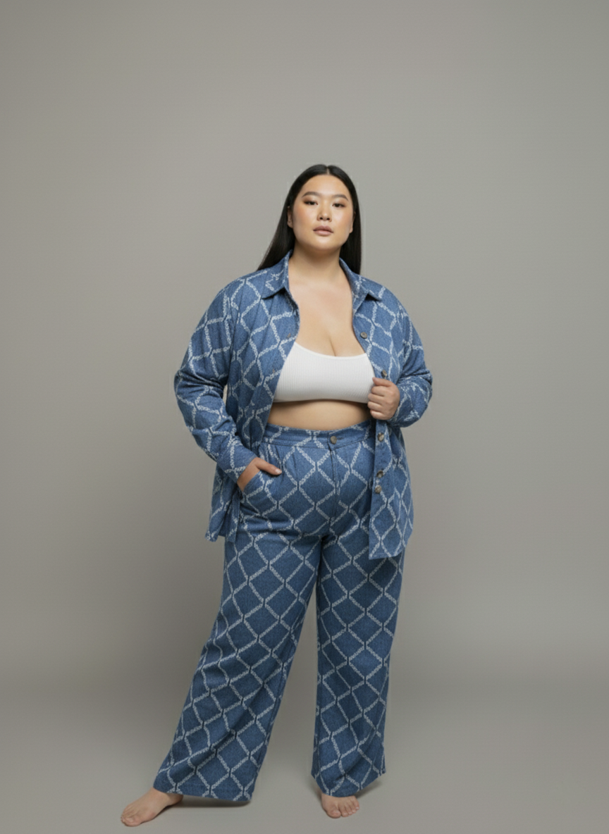הז׳קט שגונב את ההצגה – גזרת אוברסייז משוחררת מבד דמוי ג׳ינס עם דוגמת תפירה ייחודית, צווארון קלאסי וכפתורים לכל האורך. אידיאלי ללבוש מעל קרופ טופ, חולצת בסיס או סריג דק. מתאים גם ליום עבודה וגם ליציאה בערב.