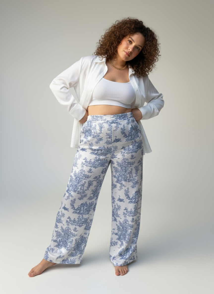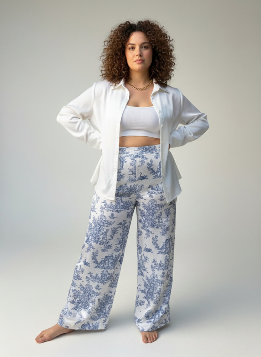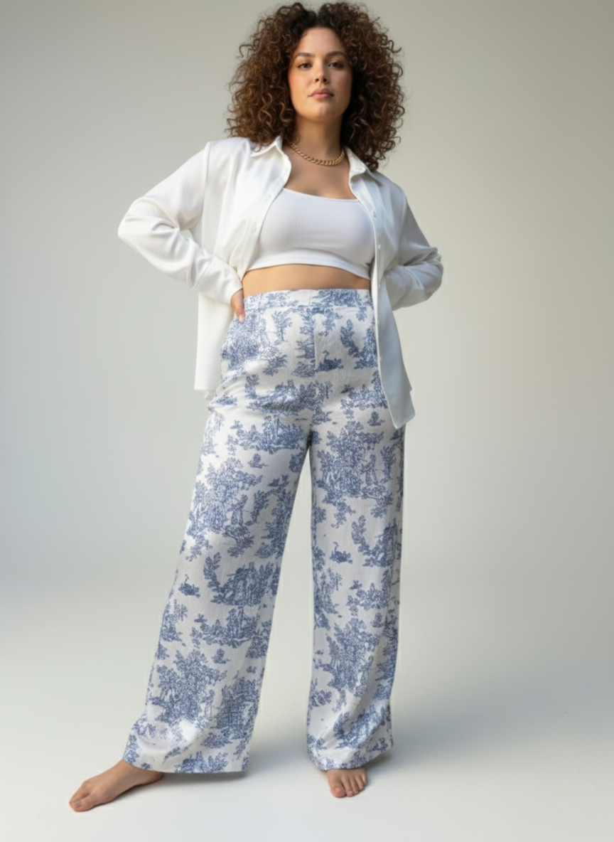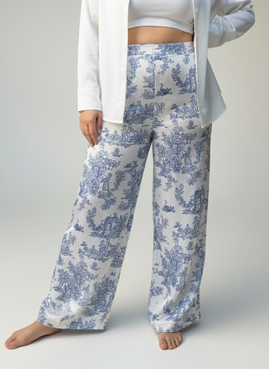 מכנסי מקסי רחבים וזורמים בהדפס וינטג’ ייחודי, שנותנים תחושה קלילה ואוורירית עם טוויסט אלגנטי. מתאימים לעבודה, ליום חופשי בעיר או לסופ״ש עם חברות – מראה effortless עם מקסימום שיק.